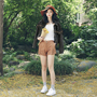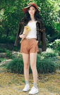 宽松的吊带+开衫两件套,棉麻的材质噢,上身很舒服呢,透气吸湿,橡皮粉很显肤白,搭配一字扣粗跟鞋,休闲又好看