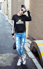 黑白拼色的字母卫衣非常修身,很帅气,利落大方,衣摆处的独特小开叉可爱又很有趣。搭配破洞仔裤和休闲鞋,看似简单却很大方。