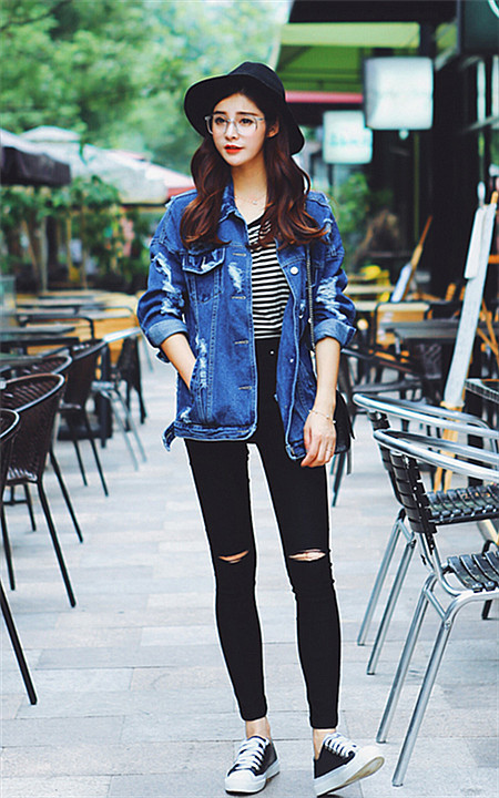 韩版帅气bf风破洞牛仔外套,内搭条纹T恤和黑色高腰膝盖破洞打底裤,显瘦且气场十足!