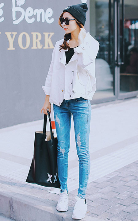 帅气BF风样式的短外套,宽松版型,大大的口袋设计,上身随性帅气,内搭打底T恤,配上水洗破洞小脚裤,街头范十足