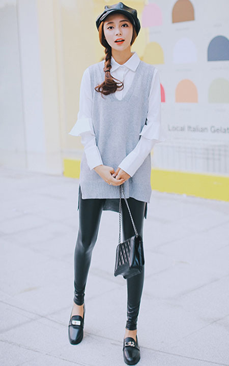 BF风V领毛线背心,中长款宽松版型,上身很时尚很洋气,内搭件气质有设计感的白衬衫,配上修身PU皮裤,展现完美曲线