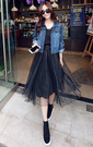 非常精致的一款牛仔小外套,个性小翻领,清爽干练,门襟单排扣,整体毛边五角星图案拼贴,内搭背心和半身网纱裙,仙气十足